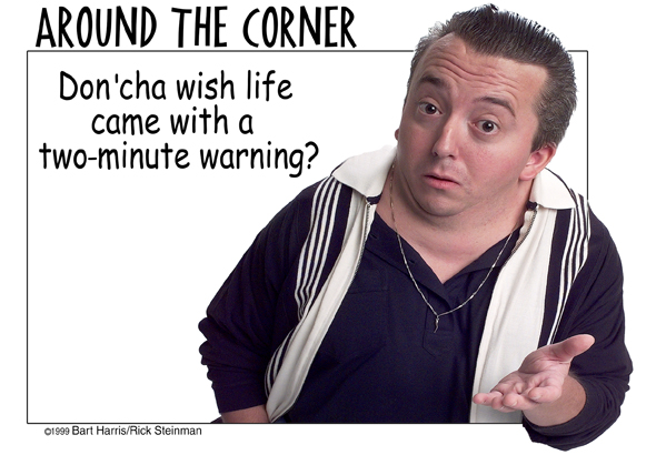 Surf the pictures by clicking Next and Previous page links. Move the mouse over the thumbnails to see a large version of the picture. Watch for new panels every few days. When a noteworthy sports moment occurs, or another overpaid, undereducated sports personality spews a gem, one of Around The Corner's characters will have something to say.