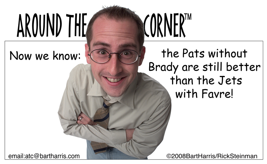 Surf the pictures by clicking Next and Previous page links. Move the mouse over the thumbnails to see a large version of the picture. Watch for new panels every few days. When a noteworthy sports moment occurs, or another overpaid, undereducated sports personality spews a gem, one of Around The Corner's characters will have something to say.