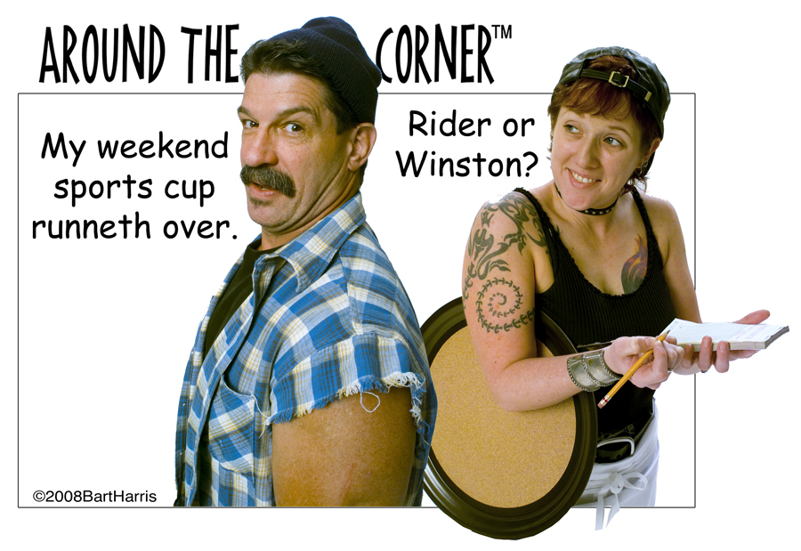 Surf the pictures by clicking Next and Previous page links. Move the mouse over the thumbnails to see a large version of the picture. Watch for new panels every few days. When a noteworthy sports moment occurs, or another overpaid, undereducated sports personality spews a gem, one of Around The Corner's characters will have something to say.
