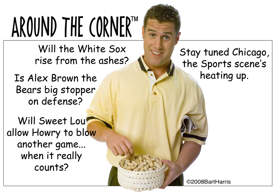 Surf the pictures by clicking Next and Previous page links. Move the mouse over the thumbnails to see a large version of the picture. Watch for new panels every few days. When a noteworthy sports moment occurs, or another overpaid, undereducated sports personality spews a gem, one of Around The Corner's characters will have something to say.