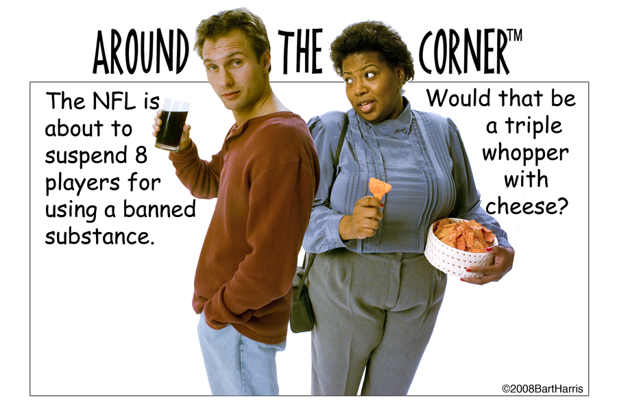 Surf the pictures by clicking Next and Previous page links. Move the mouse over the thumbnails to see a large version of the picture. Watch for new panels every few days. When a noteworthy sports moment occurs, or another overpaid, undereducated sports personality spews a gem, one of Around The Corner's characters will have something to say.
