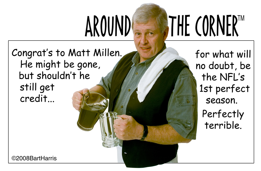 Surf the pictures by clicking Next and Previous page links. Move the mouse over the thumbnails to see a large version of the picture. Watch for new panels every few days. When a noteworthy sports moment occurs, or another overpaid, undereducated sports personality spews a gem, one of Around The Corner's characters will have something to say.