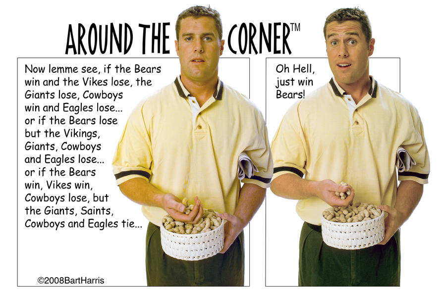 Surf the pictures by clicking Next and Previous page links. Move the mouse over the thumbnails to see a large version of the picture. Watch for new panels every few days. When a noteworthy sports moment occurs, or another overpaid, undereducated sports personality spews a gem, one of Around The Corner's characters will have something to say.